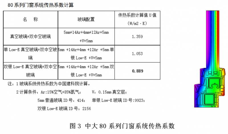 圍繞研發適合嚴寒地區使用的門窗系統產品,中大先后開發了66A系列、66C系列、66D系列、66E系列、66G系列、70系列、80系列三玻窗及單框雙層四玻窗等平開窗系統。其中國內首創的單框雙層四玻窗系統的傳熱系數檢測值 K= 1.2 W/㎡•K,中大80系列三玻平開窗系統選配真空+中空結構的三層玻璃(見圖3),其傳熱系數K= 0.889 W/㎡•K,達到了歐洲門窗行業的先進水平。