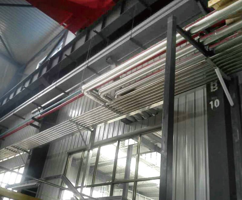根據客戶的需求和信易的設計,在雙方協商探討的基礎上,信易推出了一套包括塑料原料處理、水系統、電氣回路和壓縮空氣系統在內的整體方案?;诳蛻舻墓S布局,方案中的管路共分為三層布局,頂層為電纜橋架和壓縮空氣管道;下層為原料輸送管路;中間層為水系統。這充分考慮了客戶注塑機需冷卻水及冷凍水的需求,特意在中間放置了冷卻水管及冷凍水管。根據安全施工規范,在層間他們還設計了0.5米的安全距離,以確保所有管道按照標準設計規范安全有序分層,兼顧了美觀的需求。冷凍水管則配備高質量保溫層,通過保溫層對熱量的傳遞實現有效阻斷,從而保證冷凍水溫度均勻,冷量散失少,且避免管壁結露。分配到各機臺的水、氣管均安裝有壓力及溫度顯示儀表,可以直接真實的顯示系統水壓、氣壓及溫度等狀態量。