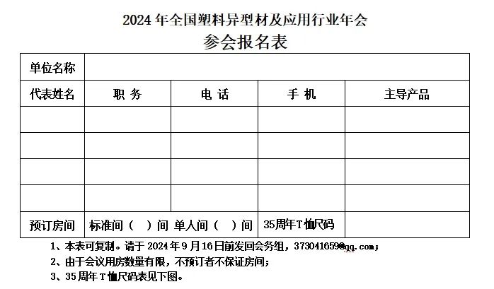 經(jīng)研究并報請中國塑料加工工業(yè)協(xié)會批準(zhǔn),專委會定于2024年9月19-21日在浙江·杭州·華盛達雷迪森廣場酒店召開“2024 年全國塑料異型材及應(yīng)用行業(yè)年會”。報到日期為9月19日。