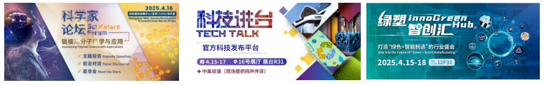 展會同期舉辦的活動,將帶來許多關于AI的話題和分享,幫助與會人士了解AI技術帶來的變革,以及為行業開辟新的增長路徑。“第三屆科學家論壇”在前沿對話環節會討論AI技術在高分子領域的無限可能;“科技講臺”將分享AI大模型在硅膠注塑成型中的創新應用;“綠塑智創匯”也將帶來一系列“綠色+智能”講座,當中包括香港工業人工智能及機械人研發中心帶來“質量控制的未來:人工智能在高分子行業的優勢和應用”,以及伊之密股份有限公司分享“3C電子數字化轉型:AI驅動注塑高質量發展”。