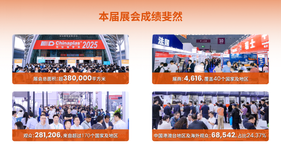 為期四天的“CHINAPLAS 2025 國際橡塑展”,于4月18日在深圳國際會展中心(寶安)圓滿落幕。這場全球橡塑行業(yè)的頂級盛會,以超38萬平方米的展示規(guī)模、4,616家參展企業(yè)、281,206名專業(yè)觀眾的亮眼數(shù)據(jù),彰顯了其作為全球領(lǐng)先橡塑展的非凡影響力和強勁號召力。