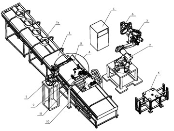 基于機(jī)器人技術(shù)的汽車塑料油箱修邊系統(tǒng)是由抓取機(jī)器人、條碼機(jī)、修邊臺(tái)、修邊機(jī)器人、稱重臺(tái)等幾個(gè)主要部件構(gòu)成,實(shí)現(xiàn)了自動(dòng)從吹塑機(jī)取出吹塑完成帶飛邊的油箱