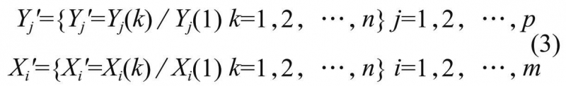 ②Y和X的無量綱處理。在分析之前,先對各指標值歸一化處理,采用初值化處理,即序列中的所有數據均與它的第一個數據相除,從而得到一個新序列。灰色關聯分析無量綱處理后的參考序列Yj’和比較序列Xi’如式(3)所示。