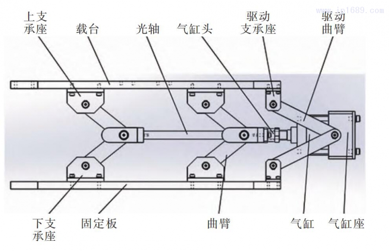 由氣缸驅(qū)動成型機(jī)構(gòu)進(jìn)行曲臂的張合,曲臂運(yùn)動從而帶動模具載臺的上下運(yùn)動,實(shí)現(xiàn)成型過程中的開模與合模過程 。曲臂式成型機(jī)構(gòu)主要由上支承座、載臺、光軸、下支承座、固定板、曲臂塊、驅(qū)動支承座、驅(qū)動曲臂和氣缸座等組成[7-8]。圖1為結(jié)構(gòu)示意圖,圖2為三維結(jié)構(gòu)圖。