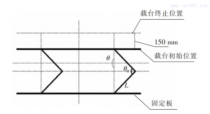 為了驗(yàn)證曲臂長度是否滿足設(shè)計要求,為運(yùn)動仿真提供初始條件,必須確定兩曲臂相交位置水平的初始和終了位移,因此需要建立機(jī)構(gòu)的運(yùn)動方程。另外,為了確定氣缸輸出壓力,需要建立機(jī)構(gòu)的受力方程 。根據(jù)實(shí)際情況,提出以下幾點(diǎn)設(shè)計要求:開合尺寸為 300 mm;成型面積不得小于 750mm×600mm;合模壓力不小于0.5 MPa;空動作循環(huán)小于 4s。載臺位移簡圖與單個曲臂受力簡圖分別如圖 3、圖4 所示。