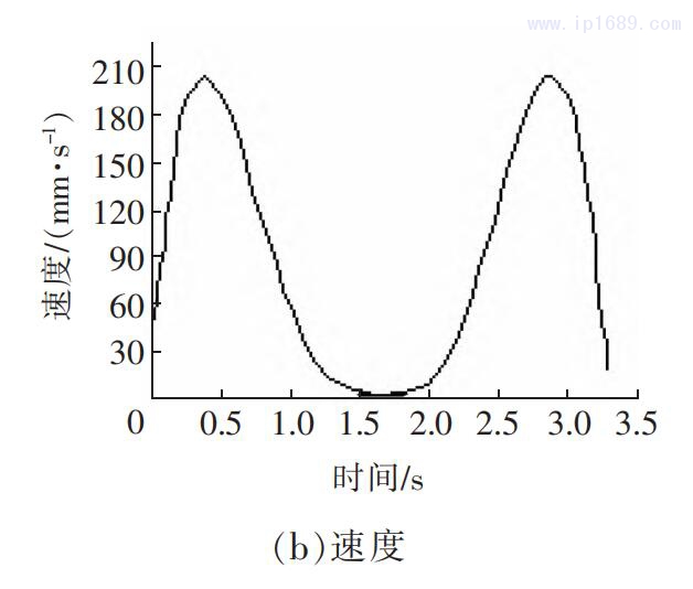 由圖 7(a)可以看出,上支承座最大位移變化為148.4 mm,接近開合尺寸的一 半 。從圖 8(b)可以看出 ,曲臂在運(yùn)動過程中會發(fā)生速度突變 ,具有較大慣性 。與閉模過程相比 ,曲臂在開模的過程中,由于重力的作用其慣性更大 。針對這種情況 ,在實(shí)際使用中,可以適當(dāng)增加成型結(jié)構(gòu)的工作循環(huán)時間,即通過使用泄氣閥適當(dāng)減少氣缸力的輸出,輔助開合模過程 ,以減小機(jī)構(gòu)慣性力 。如果從幾何參數(shù)方面進(jìn)行優(yōu)化改進(jìn) ,相應(yīng)的制造成本會增加 ,因此,適當(dāng)減小氣缸壓力是較好的改進(jìn)方法。模擬實(shí)驗(yàn)還發(fā)現(xiàn),曲臂與氣缸的夾角在 0~1.5 s 內(nèi)從141.05°變成 90.24°, 符合設(shè)計要求。