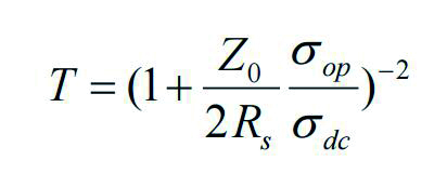 PEDOT:PSS薄膜的厚度越大,透光率更小,厚度的大小又與薄膜的方塊電阻有關,所以不能用單一個物理量來衡量薄膜的品質。為了更好的反應出薄膜的綜合性能,這里引入薄膜品質因數(shù)FoM。FoM物理意義是直流電導率(?dc)與光學電導率(?op)比值,表示符號?dc/?op。FoM可以綜合評價導電薄膜的性能,是評估透明導電薄膜的單一參數(shù)。FoM與導電薄膜透光率(T)和方塊電阻(Rs)的關系由(4)公式可得出[19,20]: