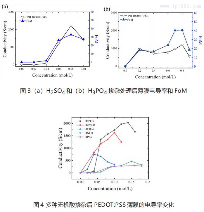 1)采用H2SO4摻雜試劑,將PEDOT:PSS薄膜的電導率從0.9S/cm提高到2216S/cm;采用H4P2O7摻雜試劑,將PEDOT:PSS薄膜的品質因數(shù)從0.03提高到40,提升了PEDOT:PSS薄膜商用價值。