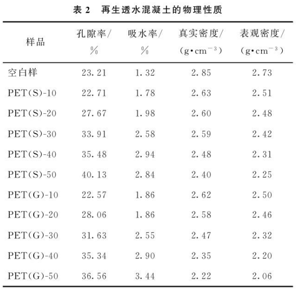 表2為不同摻量PET制備再生透水混凝土的物理性質。