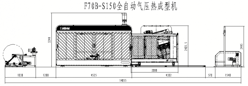 A、送片裝置:塑片伺服驅動輸送,帶齒鏈條定位,送片準確,帶有冷卻水路的鏈條軌道,冷卻邊片溫度,確保帶有尖凸齒的雙排滾子鏈準確帶動塑片進入加熱區域,鏈軌張合裝置,確保塑片下垂在控制范圍內;且具備后退功能,模臺可自動升降,模具更換方便、安全