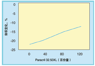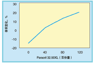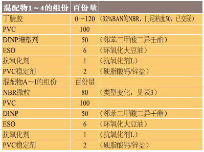 混配物1~4分別是于PVC樹脂中漸漸增加32%BAN 50門尼粘度的交聯NBR到最大120份量。總體來說,從較低NBR量直至NBR量高達120份量的混配物4,可觀察到壓縮永久形變性能和在IRM903油中老化的體積變化均得以連續改善。
