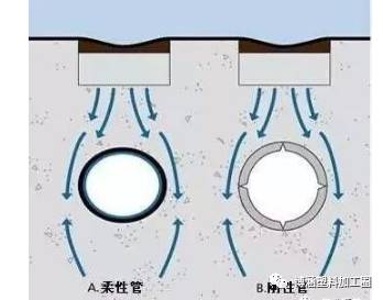 塑料管屬于柔性管,在受外壓負(fù)荷時(shí),柔性管和剛性管的承受負(fù)載的機(jī)理是完全不同的。柔性管在受壓破壞之前,可以有較大的變形,而剛性管在受外壓破壞之前不可能有較大變形。當(dāng)剛性管受外壓時(shí),負(fù)載完全經(jīng)過管材壁傳遞到底部的管床上,在管材壁內(nèi)產(chǎn)生彎矩,隨著管材直徑加大,管壁的彎矩和應(yīng)力急劇加大,所以大直徑的混凝土排水管常常需加鋼筋,而柔性管在受壓破壞前先變形----橫向外擴(kuò),管材周圍的回填土壤可以起到阻止柔性管變形和外擴(kuò)的作用,外壓負(fù)載就被傳遞和分?jǐn)偟街車幕靥钔林腥チ恕K裕谕瑯油鈮贺?fù)載下柔性管管壁內(nèi)的應(yīng)力較小,它和周圍的回填土共同承受負(fù)載,管土共同作用。因此,塑料埋地排水管不需和剛性混凝土管一樣的強(qiáng)度和剛度,在合理的剛度下,是完全可以達(dá)到使用要求的,這一點(diǎn)已被歐洲發(fā)達(dá)國家的應(yīng)用實(shí)踐所證明。