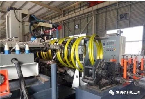 從擠塑機(jī)口模擠出的處于熔融狀態(tài)的平料帶和包覆料帶,按預(yù)定的位置均勻的纏繞在加熱的滾筒模具上,保證了結(jié)構(gòu)壁管熔接縫質(zhì)量,管材采用風(fēng)冷卻,材料冷卻均勻。特別是結(jié)構(gòu)設(shè)計(jì)中平料帶的熔接縫被料帶包覆支撐管所覆蓋,提高了制品整體的抗外壓能力。管材的水平層與加強(qiáng)結(jié)構(gòu)層在熔融狀態(tài)下熔接,熔縫質(zhì)量高,沒有內(nèi)應(yīng)力,管材的整體強(qiáng)度高。