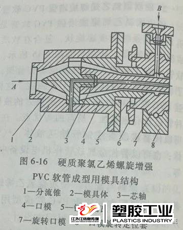 從增強軟質PVC管的成型模具結構圖中可以看出,這種復合模具結構和普通硬質PVC 管成型用模具結構基本相同,不同之處只是多了一段旋轉的口模。擠出的軟質PVC管用熔料,在復合模具中成型管坯時,由另一臺成型硬質PVC螺旋條的擠出機擠出硬質PVC熔料條,從轉動的口模側進入軟質PVC管坯內,由于口模的旋轉,使硬質PVC條纏繞在軟質PVC管坯圓周上,同時隨向前移動的管坯移動,由于有較大流量的軟質PVC熔料受成型模具內壓力作用,則在向前移動時,沒有出口模前軟質PVC熔料把硬質PVC螺旋條完全包容,成型完整的硬質聚氯乙烯螺旋軟質PVC管的管坯,被擠出口模,成型螺旋管。