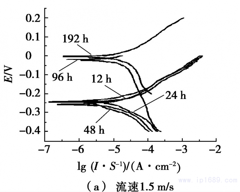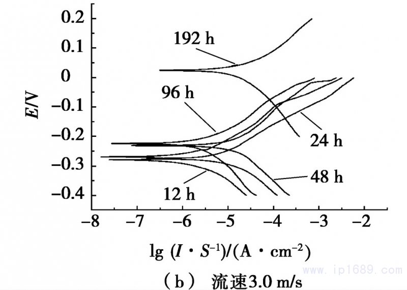 圖3 、B10銅鎳合金管材隨沖刷時間變化的動電位極化曲線