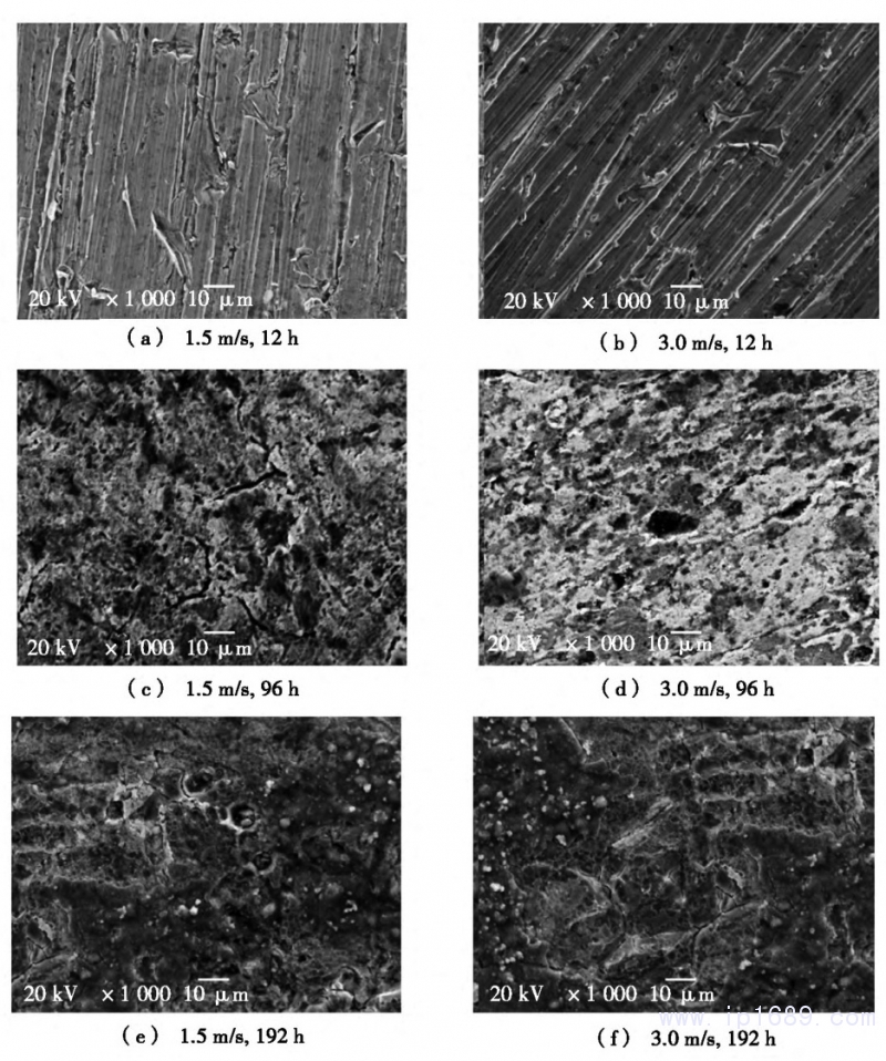 圖5為B10銅鎳合金管材在1.5m/s和3.0m/s流速下,隨著沖刷時間的延長,其微觀腐蝕形貌的掃描電鏡照片。其中,圖5a和圖5b分別為流速1.5m/s和3.0m/s時,試樣在人工海水中沖刷12h后的微觀掃描照片。從圖5a和圖5b中可以看出:在流動海水中腐蝕12h后,合金表面經砂紙打磨之后的打磨條紋依然清晰。圖5c為試樣在流速1.5m/s的海水中沖刷96h的表面微觀形貌,從圖5c中可以看出:合金表面已經形成較為完整的鈍化膜,此時的表面膜較為致密,孔隙率低。圖5d為試樣在流速3.0m/s的海水中沖刷96h的表面微觀形貌,隨著沖刷時間的延長,合金表面已經有腐蝕產物生成并附著,但腐蝕產物膜并不完整。圖5e為試樣在流速1.5m/s的海水中沖刷192h的表面微觀形貌,合金表面膜更加完整致密。圖5f為試樣在流速3.0m/s的海水中沖刷192h的表面微觀形貌,此時合金表面打磨劃痕已經消失,表面形成一層致密均勻的鈍化膜,能有效降低腐蝕反應速率。合金表面這一變化過程表明:當模擬海水的流速為1.5m/s時,銅鎳合金初期的腐蝕速率高于后期,沖刷96h后開始形成鈍化膜。當模擬海水的流速為3.0m/s時,銅鎳合金腐蝕速率達到最大,并且在沖刷192h后才開始形成鈍化膜,但是鈍化膜很不穩定,容易被破壞。