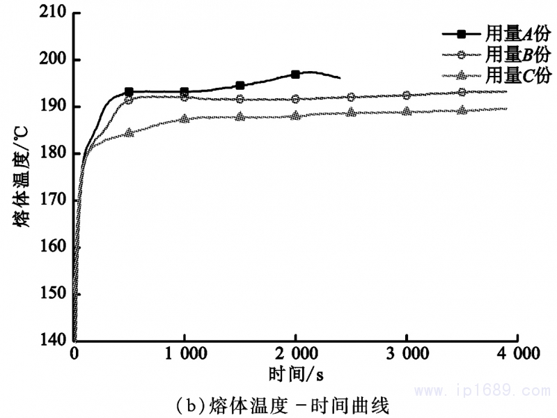 大口徑PVC給水管材的成型設備大,物料在設備中的停留時間長,因此要求物料的熱穩定性較好,塑化速率既不能過快也不能過慢。有機錫穩定劑的用量(A< B < c)對PVC物料流變性能的影響如圖 2所示。由圖2可以看出:當有機錫穩定劑的用量為份時,PVC物料塑化速率過快,穩定時間較短,熔體溫度也不穩定;當有機錫穩定劑用量為B份時,PVC物料的塑化速率適中,穩定時間較長,熔體溫度相對穩定;當有機錫穩定劑的用量為c份時, PVC物料出現不塑化的狀況,說明有機錫穩定劑的用量過多。