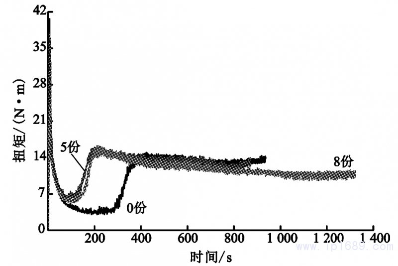 由圖8可以看出:當納米碳酸鈣的用量為5、8 份時,PVC物料的塑化時間較短,比未加人納米碳酸鈣時縮短了約200 so這是因為納米碳酸鈣粒子對提高體系的內摩擦具有促進作用,使PVC粒子殼層破碎加速,促進了PVC塑化[ 5 ]。此外,當納米碳酸鈣的用量為8份時,PVC物料的穩定時間最長,表明納米碳酸鈣還具有提高熱穩定性的作用。