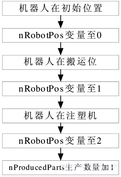 本論文中采用對注塑機加工的過程進行監控,注塑機的整個過程如圖2所示。仿真生產線的流程設計如下:機器人運行至皮帶,然后提取物料進入注塑機、注塑機模擬加工、機器人從注塑機提取物料放入皮帶,注塑機停止運行,生產產品計數。