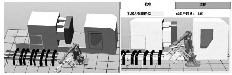 機器人在生產時,其生產過程將會實時顯示在示教器界面中。如圖5所示為機器人系統在維修時監控到的畫面,圖5右側為仿真工作站機器人停留在維修位中的畫面,圖左側為示教器界面下監控到的機器人在維修時的畫面,在示教器畫面的上面有文字提示機器人所處位置及生產零件的數量。