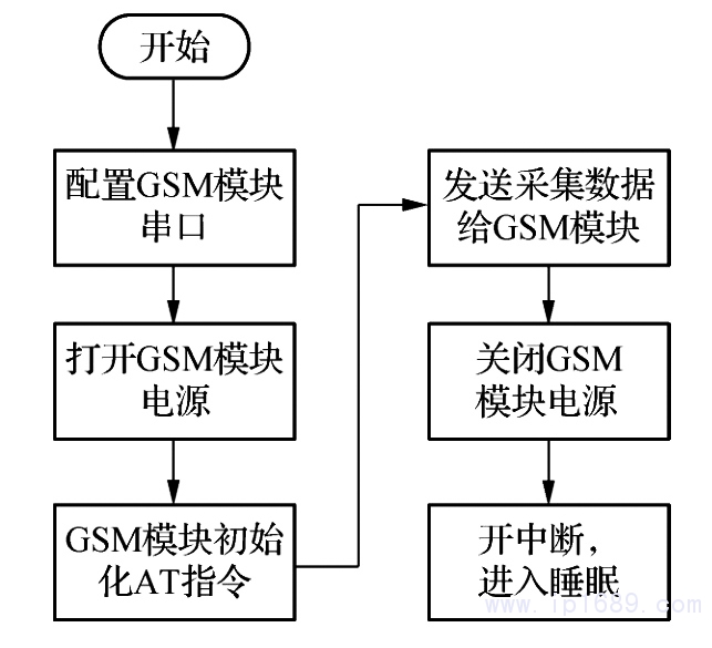 圖9所示為主控制模塊工作流程.模塊上電復位后,首先進行系統硬件初始化工作;完成初始化后,模塊的采集單元定時采集橡塑機的溫度數據和設備運行狀態,并通過 GPRS模塊傳送到云服務平臺[6].圖10所示為 GPRS通信流程.GPRS模塊上電后,首先對串口進行配置并開啟 GSM 模塊電源; 電源打開后, 模塊初始化AT指令,接著接收GSM主控制發送的采集數據并上傳到采集機模塊;完成數據發送后,關閉 GSM 模塊電源并開中斷進入睡眠模式,等待下一次喚醒。