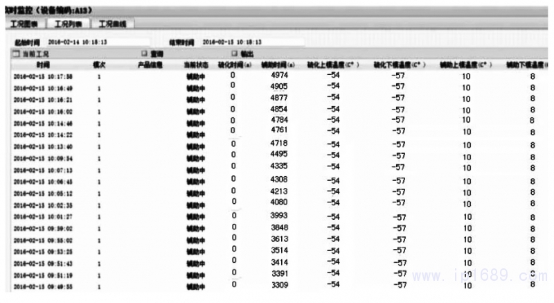 圖12所示為硫化橡塑機的工況測試信息界面.該界面可通過圖表、列表和工礦曲線的形式實時顯示每臺硫化橡塑機的工礦信息,工況信息包括硫化時間、輔助時間以及硫化上、下模溫度等指標.通過這些數據,管理人員可實時監控生產過程中的硫化機溫度,降低工人因為人為失誤或懈怠出現的殘次品概率,嚴格把控硫化產品質量。