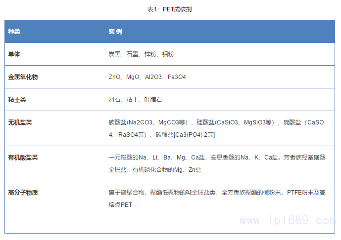 PET 廣泛應用于薄膜和纖維,作為工程塑料,應用還非常有限。這主要是由于PET 較慢的結晶速率和過長的成型周期造成的。此外,PET 結晶溫度也非常高,其注塑模溫達到120~140 ℃,使它的生產周期太長,經濟性差。所以一般要在其中加入成核劑和結晶促進劑,提高其結晶速率, 降低模具溫度。目前PET 最常用的成核劑是滑石粉(異相成核)。以下表格為PET的成核劑和結晶化促進劑匯總。