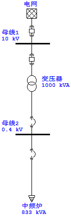 該鋼鐵廠所使用的中頻爐是一種嚴重的諧波源,其對無功功率的需求拉低了電網功率因數,已嚴重影響了工廠電網中其它電器設備的正常工作。該鋼鐵廠各中頻爐均由單回10KV電源進線經一臺容量為1000kVA、變比為10/0.4kV的變壓器供電。中頻爐為六脈沖整流裝置,額定功率
