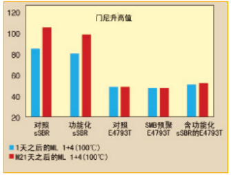在填料網絡中,未硫化化合物的再團聚和隨之而來的門尼上升,通常在貯存條件下會增加門尼值。我們在21天后測試了化合物的門尼,發現SMB產品非常穩定,不存在任何上述的問題。而干混化合物的門尼值有很大的增加(圖1)。