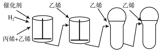 由于乙烯分子較丙烯分子小,在聚合過程中,乙烯與催化劑的反應速率遠高于丙烯,而H2作為相對分子質量調節(jié)劑也會優(yōu)先被催化劑的活性中心吸附,最終將導致PP小分子部分中乙烯含量偏高,而高相對分子質量部分中乙烯含量反而偏低, 使PPR性能不穩(wěn)定。實際生產中,需使PPR的高相對分子質量部分中乙烯含量盡可能高,低相對分子質量部分中乙烯含量相對低,這樣才能使乙烯較均勻地分布在PPR中,保證其沖擊強度及批次間的質量穩(wěn)定性。為解決這一問題,國內PPR生產企業(yè)一般通過第1個反應器中加入少量乙烯,其余反應器中乙烯含量逐漸增加的方式使乙烯盡可能均勻地分布在不同相對分子質量層級的PPR中。僅使用1個反應器的Unipol工藝,無法從根本上控制乙烯分布,乙烯分散性較差。
