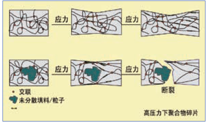 圖2和圖3顯示了短纖維與其它增強材料的不同之處。當高應力應用于具有良好整體分散性的橡膠零件時,該零件將保持其完整性。然而,當相同的力被應用到有分散不良或凝聚顆粒的橡膠部件時,橡膠和粒子之間的界面會發生斷裂,從而導致失效。含有良好分散短纖維的同一橡膠制品在類似的應變下能抵抗斷裂,很有可能在不失效的情況下抵抗更高的應變。