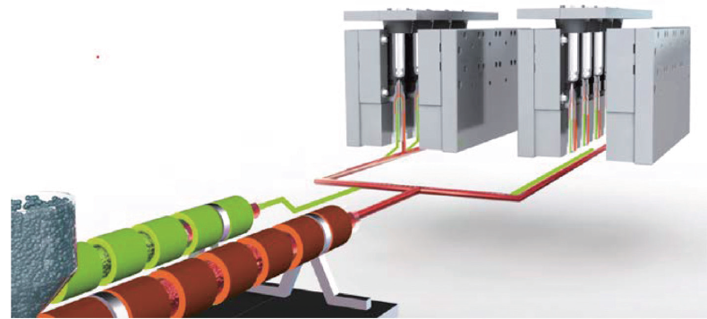 Kavoblow工藝因其活性和生產效率優勢而引人注目。在同一系統內,即可制造諸如非圓形和偏心口包裝以及PET、PP或其它各種不同材料的不同色彩方案。包裝產品可以涵蓋口徑非常小的容器如雪碧瓶,也可用于生產食品工業的大型寬頸容器,口徑介于8毫米至150毫米之間。這一技術的另一大優點在于,與現有機器概念相比,其效率更高、制造成本更低。采用Kavoblow不是逐排生產預制件,而是數排(圖2)一起生產,目前可以生產12至32個空腔,因而可以在短時間內生產多只瓶子或容器。這一工藝特別適合每年500萬至2000萬的產量(或者大多數為3排和4排系統的情況)段,并且擁有以前兩步法系統所具有的高效高品質一步生產的需求。