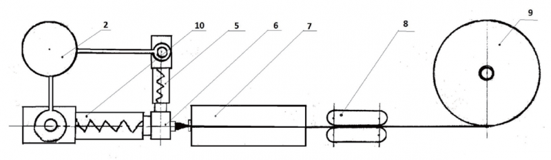 (2、原料預處理裝置;5、涂覆層供料擠出機;6 、擠出涂覆機頭;7、定徑冷卻裝置;8、牽引裝置;9、成品管卷取裝置;10、芯管擠出成型機)