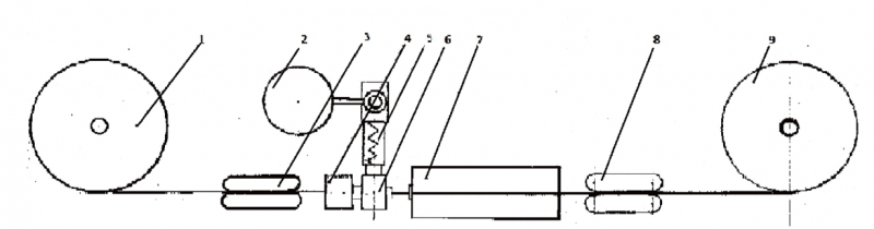 (1、成品塑料管;2、原料處理裝置;3、送管機;4、管材表面預熱等離子處理裝置;5、擠出機;6、擠出涂覆機頭;7、定型冷卻裝置;8、牽引機;9、涂覆了TLCP/PO合金層的阻氧塑料管)