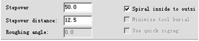 選擇曲面粗加工方法中的cons tan(t 平行環(huán)繞并清角)從外徑內(nèi)走刀方式,銑削方向為順銑,第一刀背吃刀量0.5 mm, 刀路重疊50%,參數(shù)設(shè)置如圖3 所示,轉(zhuǎn)速為15 000 r/min, 進(jìn)給速度為 5 000 mm/mim,粗加工和半精加工時將擬合誤差值,設(shè)為0.5,太小加工速度會減慢,加工時間會變長。