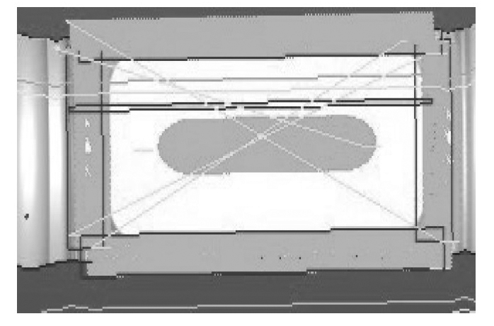 由于此型面屬于軸類轉(zhuǎn)軸面,型腔內(nèi)兩側(cè)面矩形凸臺加工留有欠切,旋轉(zhuǎn)60°后采用區(qū)域加工,加工范圍為矩形凸臺的四周倒角與角臺上方的半圓形凸起部分。由于旋轉(zhuǎn)后工件單側(cè)升高了,為了不發(fā)生撞刀而采用了加長刀具。為了改善表面質(zhì)量及表面刀紋的一致性,4 個倒角面采用先加工兩個長側(cè)面,再加工兩個端面。這樣可以有效地避免加工到凸臺時頻繁抬刀的動作,節(jié)約了輔助時間,提高了效率,具體參數(shù)設(shè)置跟精加工時一樣,區(qū)域加工刀具路徑如圖6 顯示效果圖。