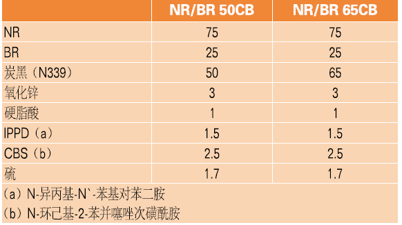 本研究中使用的聚合物為天然橡膠(NR:馬來西亞恒粘膠SMR CV60標準膠)和高順丁二烯橡膠(BR:來自阿朗新科的BUNA CB24釹系稀土順丁橡膠)。補強填料為N339級炭黑(CB)。所有其他成分均是橡膠級化學品。橡膠配方在表1中給出。