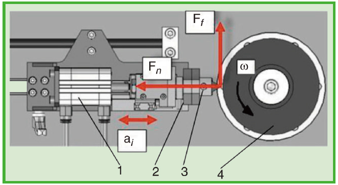 儀表化的切割和崩花分析儀的測量原理包括以選定轉速旋轉圓形橡膠試樣,并在給定頻率下用不銹鋼撞擊器撞擊試樣。使用氣動氣缸產生沖擊力,其對橡膠表面的撞擊正向力、頻率和接觸(滑動)時間都可以單獨控制。圖3顯示了撞擊裝置的示意圖,圖4描述了撞擊器幾何外形,并給出了每個撞擊事件生成的數據示例,如圖5所示。表2概述了輸入和輸出的參數類型以及它們的范圍,強調了測試設備的高度儀表化和靈活特性。