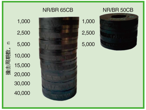 圖7、使用文中描述的條件,NR/BR 65CB和 NR/BR 50CB化合物撞擊周期數對P的影響