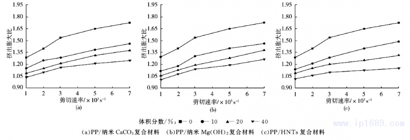 2.2剪切速率對復(fù)合材料擠出脹大比的影響