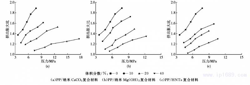 圖3為PP/納米CaCo3復(fù)合體系、PP/納米Mg(OH)2復(fù)合體系、PP/HNTs納米復(fù)合體系分別在填充體積分?jǐn)?shù)為0、10%、20%、40%時(shí),擠出脹大比隨壓力的變化曲線。可以看出,3種復(fù)合材料熔體的擠出脹大比隨著壓力的增加而增大。壓力增加,熔體在毛細(xì)管中的流速加快,熔體在流道中的流經(jīng)時(shí)間變少,且如式(2)所示熔體的擠出脹大比隨著熔體在口模內(nèi)流經(jīng)時(shí)間的減小呈指數(shù)關(guān)系增加[7]。