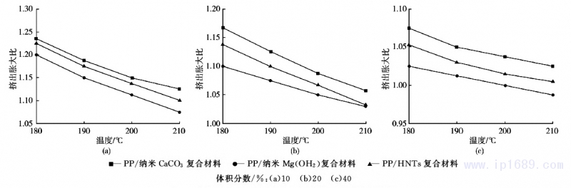 本文采用PP為基體,分別向PP中高填充球狀粒子納米CaCo3、片狀結(jié)晶納米Mg(OH)2和棒狀粒子HNTs,研究了口模溫度、剪切速率、壓力和納米粒子填充量及形貌對聚合物納米復(fù)合材料擠出脹大比的影響。