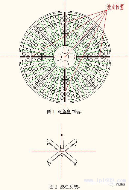 本實(shí)例為一鮑魚盤模具,外徑為500mm,其上均布有數(shù)百個(gè)直徑相等的小孔且為通孔,其制品形狀如圖1所示,模具澆注系統(tǒng)如圖2所示。