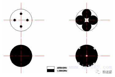 解決上述問題的最簡(jiǎn)單辦法是堵死中心澆口。由圖1和圖2可看出,堵住中心澆口后,4個(gè)澆口處的△P值已達(dá)到一致,不再存在壓力不均現(xiàn)象,但隨之而來又出現(xiàn)一個(gè)新問題,制品在中心點(diǎn)處成型后極易形成燃燒點(diǎn),對(duì)制品來說是不可接受的,顯然問題并未得到根本解決,如圖4所示。于是,我們據(jù)實(shí)對(duì)改動(dòng)后模具進(jìn)行一次打樣分析,發(fā)現(xiàn)制品成型后會(huì)留下一f3~f8mm的燃燒點(diǎn)。