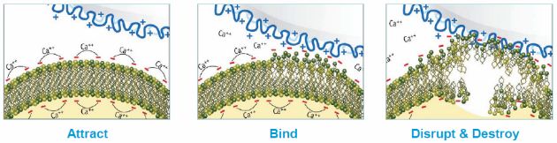 具有高電荷密度的無毒長鏈聚合物(聚陽離子)通過對微生物的物理作用提供優(yōu)越的功效。先進的陽離子高分子抗菌聚合物吸引細菌細胞并迅速結合以取代鈣離子,從而在物理上破壞細胞壁。然后細胞膜塌陷,細胞質泄漏時細胞死亡。