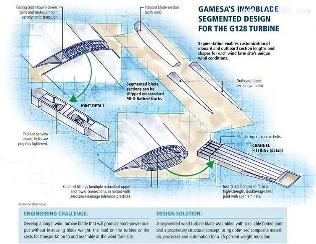 Gamesa通過一種設計方案解決了這一挑戰,設計了一個用可靠的螺栓連接和專有結構概念組裝的分段葉片,使用了優化的復合材料、工藝和自動化,使其重量減少了25%。