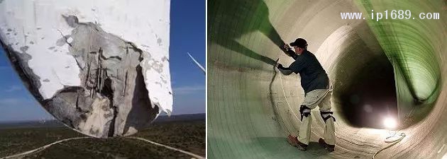 風力發電機災難性損壞(左)和工廠修復(右)。