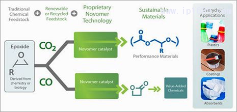 Novomer開發了以CO2為主要原料生產聚丙烯碳酸酯(PPC)和聚碳酸乙烯酯(PEC)的技術?;贑O2與環氧丙烷(PO)或其他環氧化合物的共聚合,聚合物可以同時作為熱塑性聚合物和用于包裝和涂覆產品的多元醇來生產。