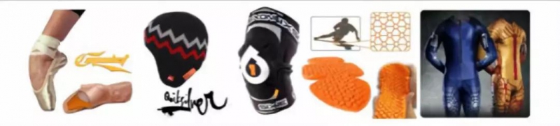 D3O沖擊吸收智能材料應(yīng)用(左起)- 芭蕾舞鞋,頭飾,護膝,滑雪墊,運動服