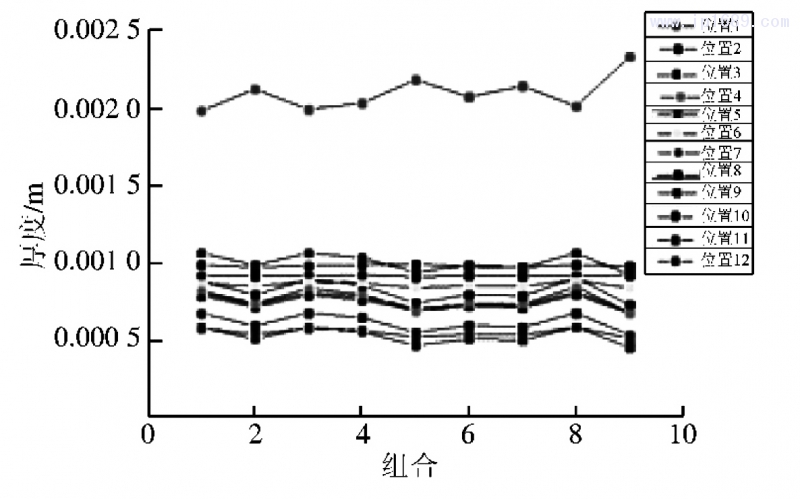圖 7 9 種方案的 12 個位置的厚度分布情況